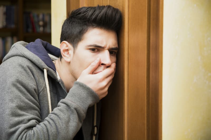 As David wanted to walk back to his kitchen, he noticed the door was shut. He frowned as he thought he had left the door open on his way out. Suddenly he realized the intruder could still be inside his house. He quietly walked over to the door and put his ear against it to listen.