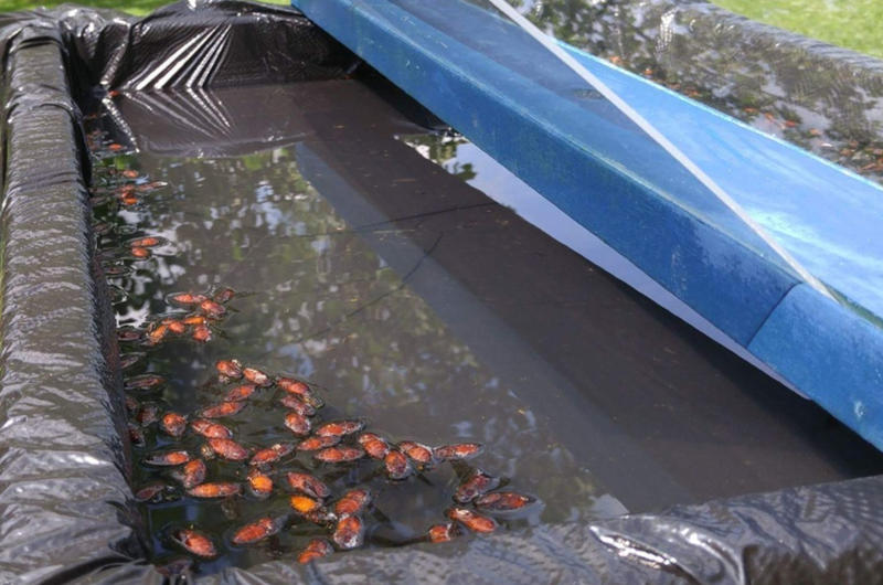 The idea was the black garbage bags would attract the horseflies, and then they would run into the plexiglass and fall into the water – the key being that Tim had to make sure the glass was always clean and therefore invisible to the flying monsters. The collection that had accumulated over the past hours was astonishing.