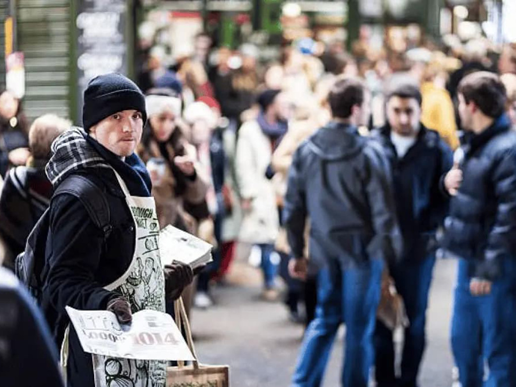 He was handing out newspapers, but his attitude and gaze was definitely not focused on park visitors.